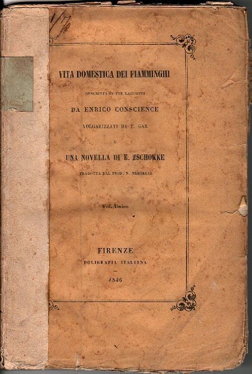 Racconti I. Tradotti dal Nicola Negrelli. Monaco, Giorgio Franz, (1854). [VIII] + 178 p. [Quintino Metsys ; Il maestro di scuola al tempo di Maria Teresa; La nuova Niobe ; Rikke-tikke-tak; La nonna, in due racconti ; Striata formosissima, o la febbre delle Dalie] (Racconti di Enrico Conscience, I)