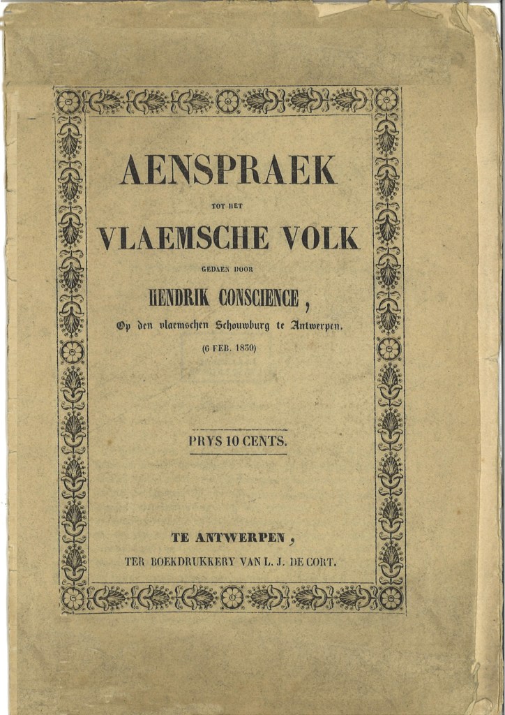 1839: Aenspraek tot het Vlaemsche Volk gedaen door Hendrik Conscience. Op den Vlaemschen Schouwburg te Antwerpen. (6 Feb. 1839). Te Antwerpen, Ter boekdrukkery van L.J. de Cort (1839). 12 p. (22 x 13) (Op de laatste blz. ondertekend: Johan Alf. De Laet. Hendrik Conscience)