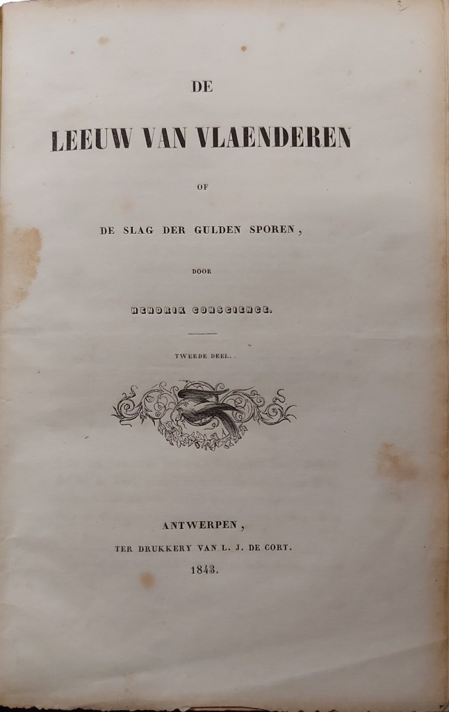 1843: De Leeuw van Vlaenderen of de Slag der Gulden Sporen, door Hendrik Conscience. [Tweede uitgave.Antwerpen, Ter drukkery van L.J. de Cort, 1843. 213 + 202 + 201 p. (20 x 12,8) [Gele kaft]