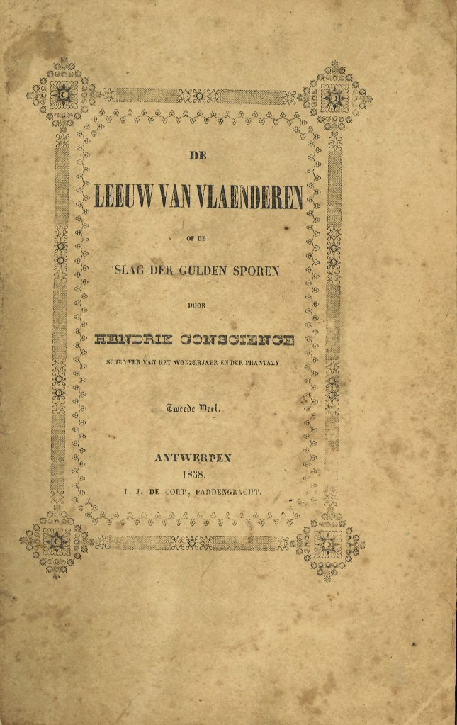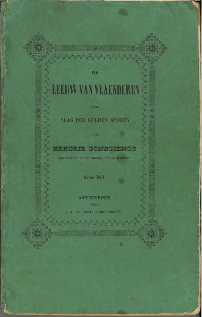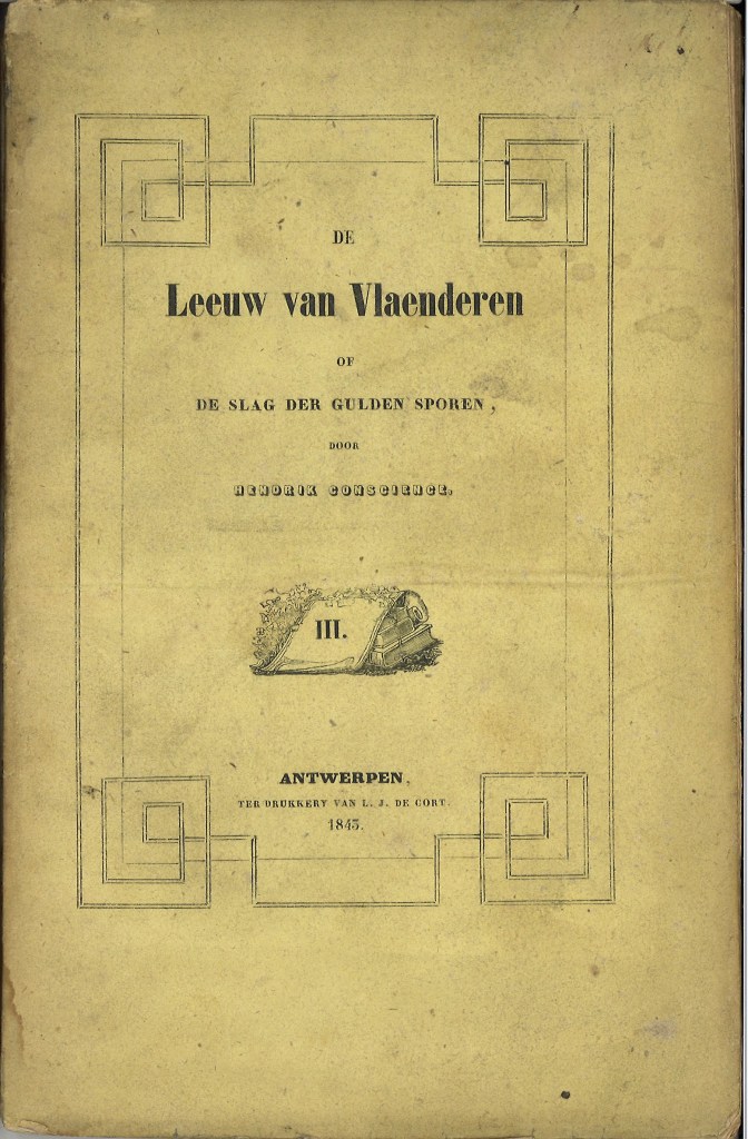 De Leeuw van Vlaenderen of de Slag der Gulden Sporen door Hendrik Conscience, schryver van Het Wonderjaer en der Phantazy, lid der Antwerpsche Rederykkamer en der Koninglyke Maetschappy van Schoone Kunsten te Gent. Antwerpen, L.J. de Cort, Paddengracht, 1838. x, 206 + 194 + 190 p. (24,3 x 15,3)