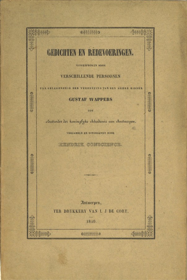 1840: Gedichten en Redevoeringen, uitgesproken door verschillende persoonen ter gelegenheid der verheffing van den Heere Ridder Gustaf Wappers tot bestierder der Koninglyke Akademie van Antwerpen. Verzameld en uitgegeven door Hendrik Conscience. Antwerpen, Ter drukkery van L.J. de Cort, 1840, 44 p.