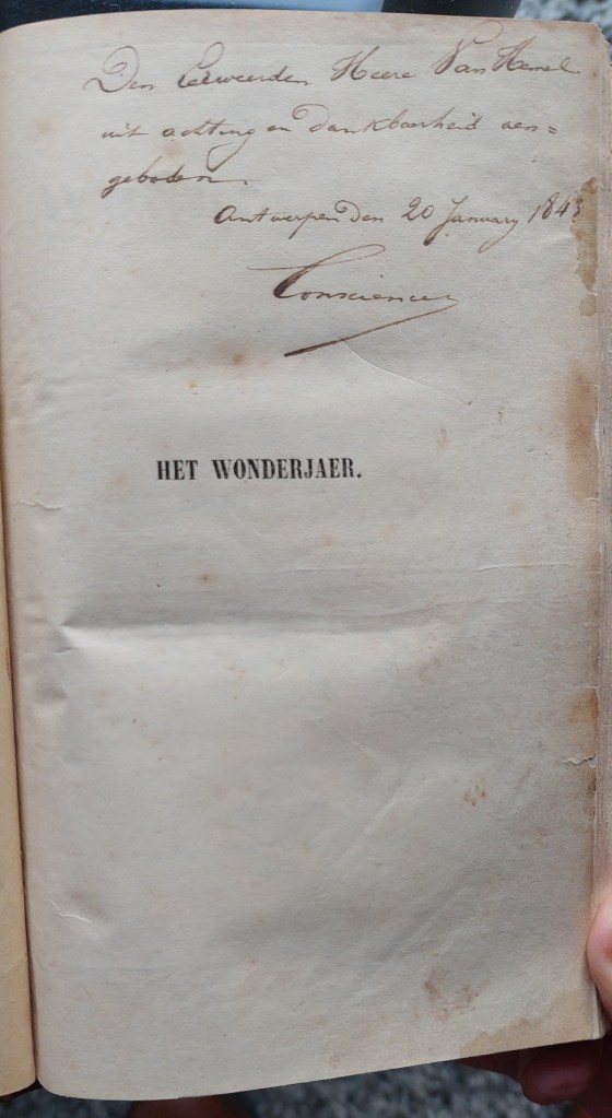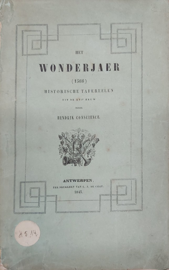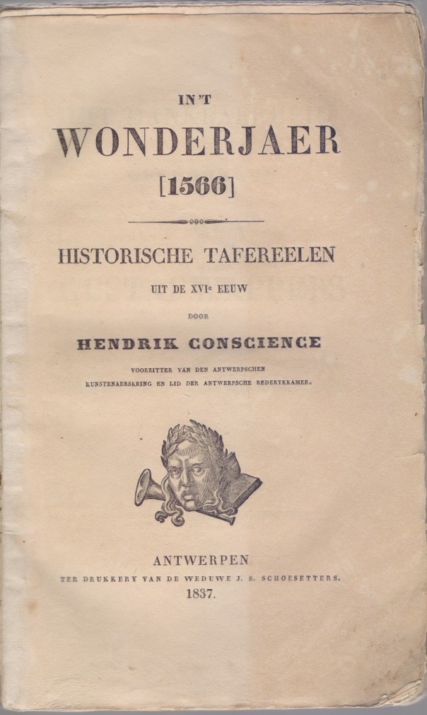 1837: In ’t Wonderjaer (1566). Historische tafereelen uit de XVIe eeuw door Hendrik Conscience, Voorzitter van den Antwerpschen Kunstenaerskring en lid der Antwerpsche Rederykkamer. Antwerpen, Ter drukkery van de weduwe J.S. Schoesetters, 1837, iv + 191 p. (22 x 13,2)