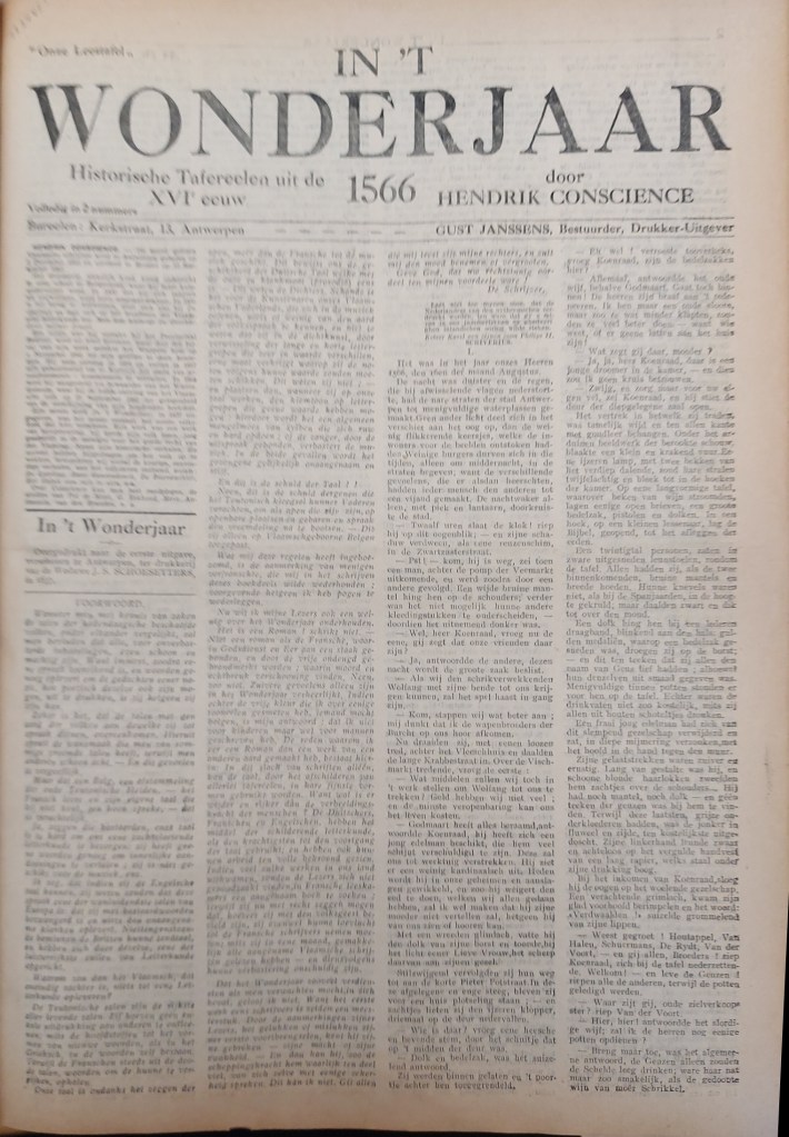1917: In ’t Wonderjaar (1566). Historische tafereelen uit de XVIe eeuw door Hendrik Conscience. Overgedrukt naar de eerste uitgave, verschenen te Antwerpen, ter drukkerij van de Weduwe J.S. Schoesetters, in 1837. Volledig in 2 nummers, in: Onze leestafel, nr. 44-45; [nr. 44] p. 1-8, nr. [45], p. 1-8 [Verschenen op donderdag 23 augustus 1917]