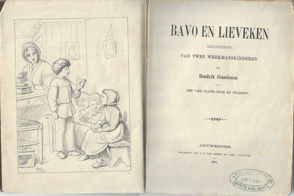 1865: Bavo en Lieveken. Geschiedenis van twee werkmanskinderen. Met vier platen door Ed Dujardin. Antwerpen, Drukkerij van J.P. van Dieren en comp., uitgevers, 1865, 208 p. (18,5 x 13,8) (Oplage: 2.500)