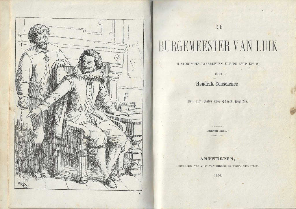 1866: De burgemeester van Luik. Historische tafereelen uit de XVIIe eeuw. Met acht platen door Eduard Dujardin. Antwerpen, Drukkery van J.P. van Dieren en comp., uitgevers, 1866, 188 + 183 p. (18,5 x 13,8) Gele kaft (Oplage: 2.500)