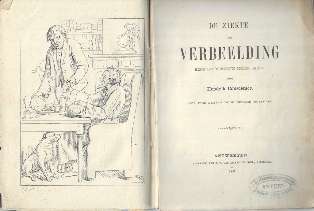1865: De ziekte der verbeelding. Eene geschiedenis onzer dagen. Met vier platen door Eduard Dujardin. Antwerpen, Drukkery van J.P. van Dieren en comp., uitgevers, 1865, 192 p. (18,5 x 13,8) [LH: met opdracht aan P. Dedecker, gedat.: 12.11.1865] gele cover