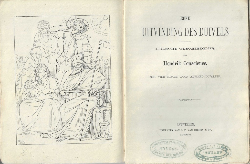 1864: Eene uitvinding des duivels. Helsche geschiedenis. Met vier platen door Edward Dujardin. Antwerpen, Drukkery van J.P. van Dieren en Cie, Uitgevers, s.a., 64 p. (18,5 x 13,8) (2.500 ex.)