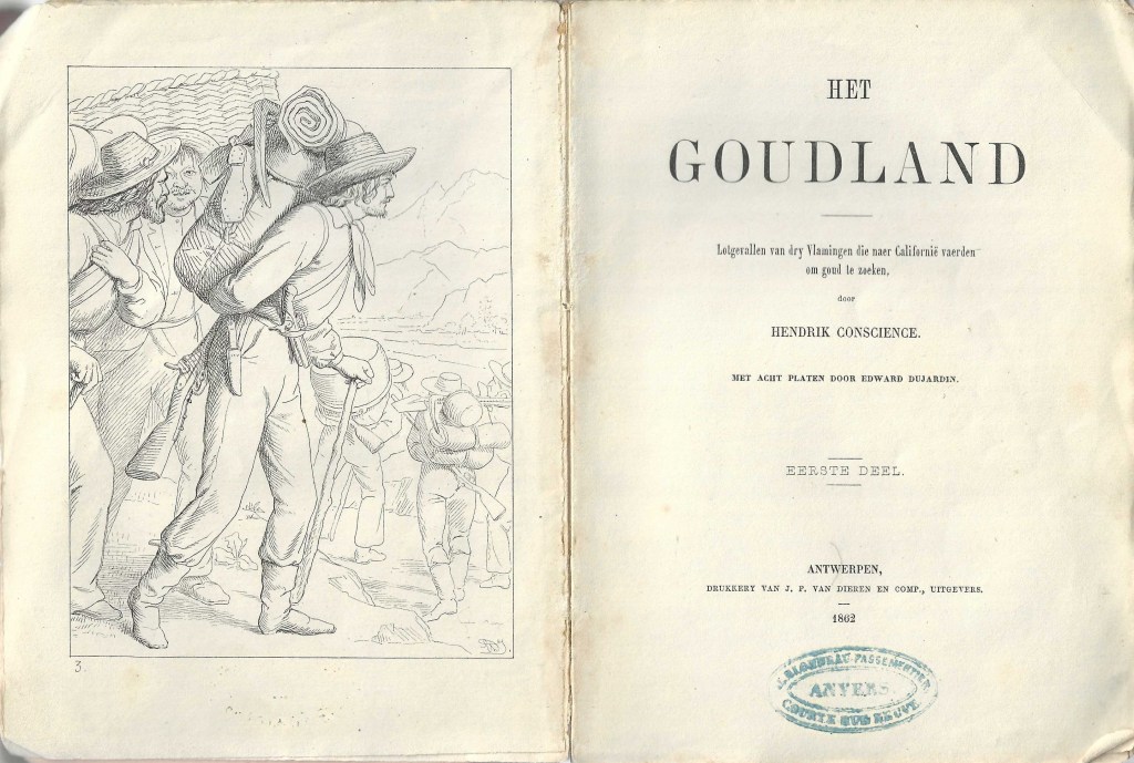 1862: Het Goudland. Lotgevallen van dry Vlamingen die naer Californië vaerden om goud te zoeken. Met acht platen door Edward Dujardin. Antwerpen, Drukkery van J.P. van Dieren en comp., uitgevers, 1862, 210 + 242 p. (18,5 x 13,8) (beige met zwart) [Een deel van de oplage werd in 1863 voorzien van het kaftje van de VW 1861-1863 Afl. 80-83]