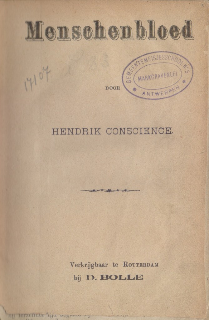 1879: Menschenbloed. Antwerpen, Drukkerij van J.P. van Dieren en Comp., 1879, [4] + 90 p., (19,8 x 13) (Oplage: 6.000)