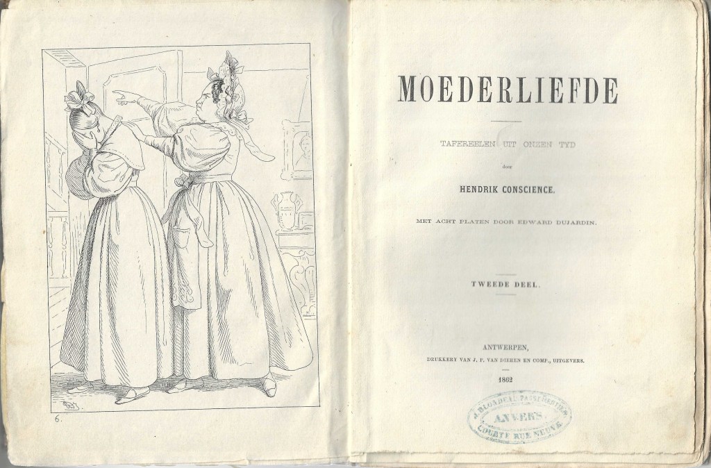 1862: Moederliefde. Tafereelen uit onzen tyd. Met acht platen door Edward Dujardin. Antwerpen, Drukkery van J.P. van Dieren en comp., uitgevers, 1862, 198 + 215 p. (18,5 x 13,8) [Een deel van de oplage werd in 1863 voorzien van het kaftje van de VW 1861-1863 Afl. 87-89]